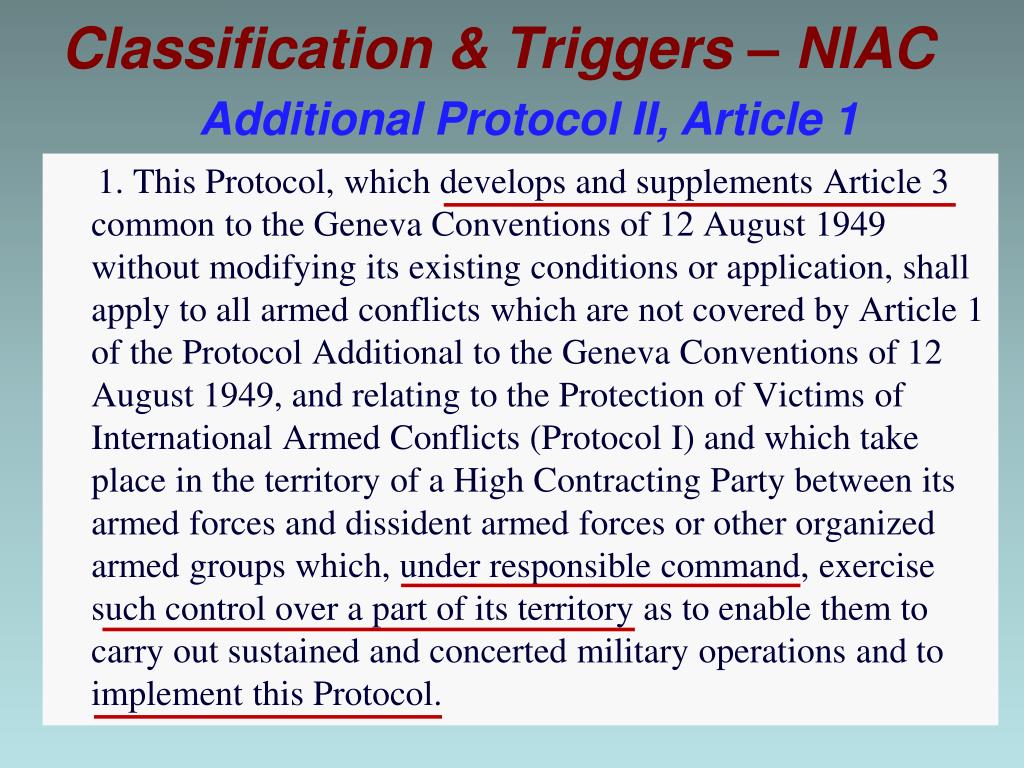Classification & Triggers – NIAC Additional Protocol II, Article 1 1. This Protocol, which develops and supplements Article 3 common to the Geneva Conventions of 12 August 1949 without modifying its existing conditions or application, shall apply to all armed conflicts which are not covered by Article 1 of the Protocol Additional to the Geneva Conventions of 12 August 1949, and relating to the Protection of Victims of International Armed Conflicts (Protocol I) and which take place in the territory of a High Contracting Party between its armed forces and dissident armed forces or other organized armed groups which, under responsible command, exercise such control over a part of its territory as to enable them to carry out sustained and concerted military operations and to implement this Protocol.