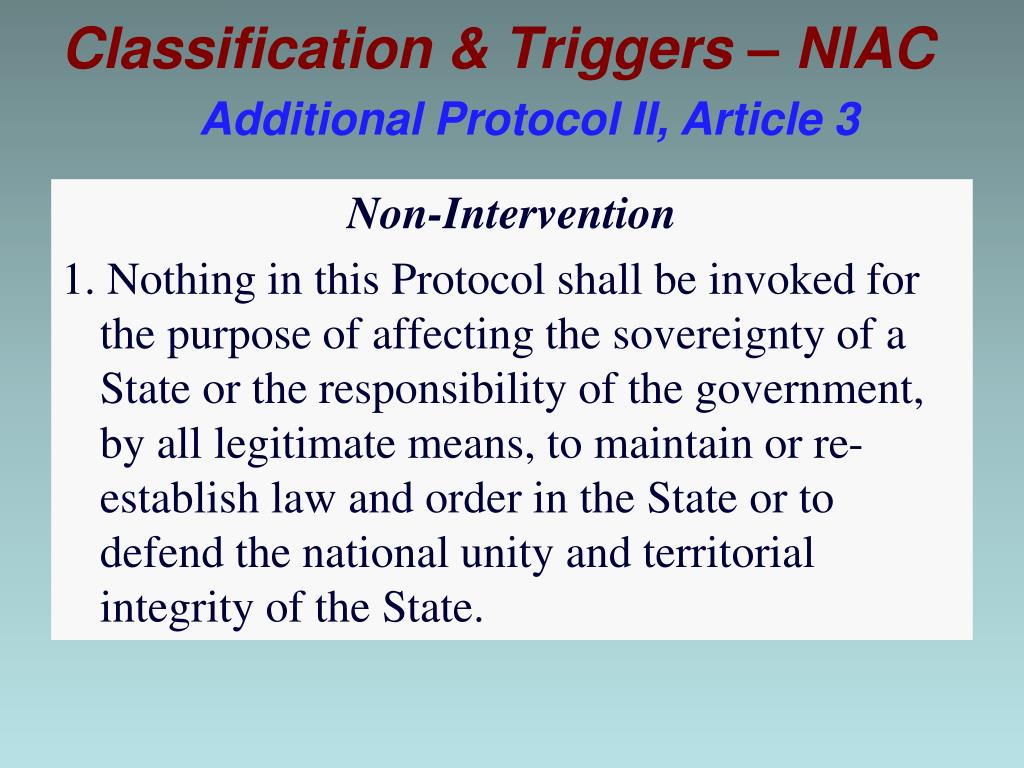 Classification & Triggers – NIAC Additional Protocol II, Article 3 Non-Intervention 1. Nothing in this Protocol shall be invoked for the purpose of affecting the sovereignty of a State or the responsibility of the government, by all legitimate means, to maintain or re-establish law and order in the State or to defend the national unity and territorial integrity of the State.