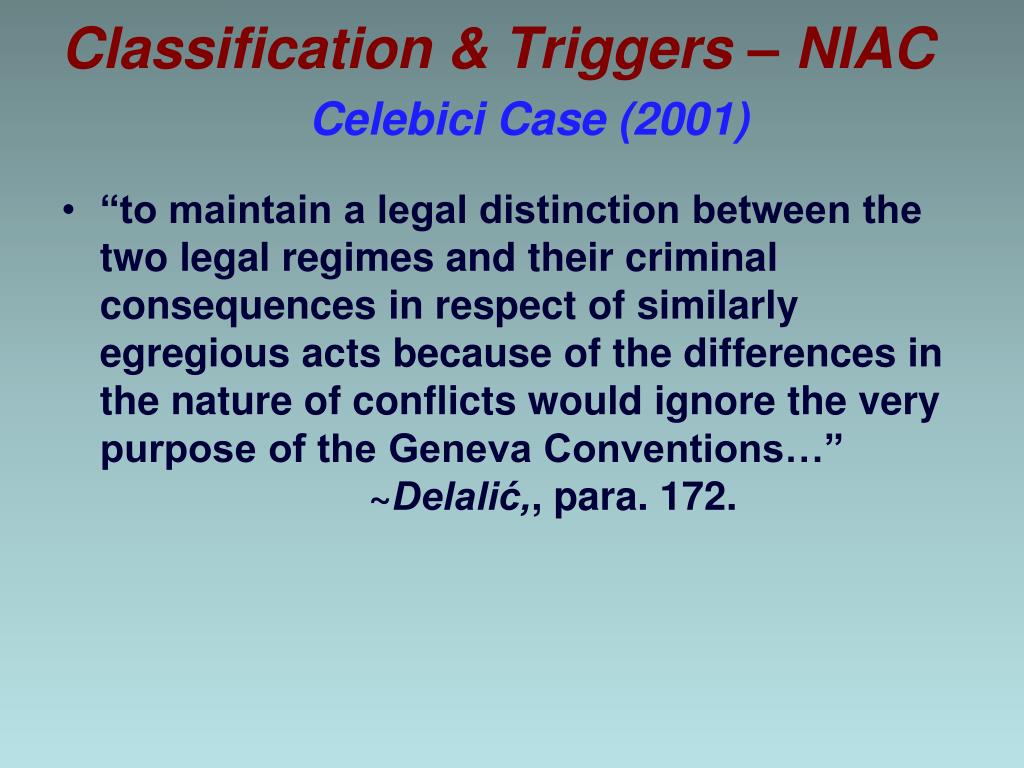 Classification & Triggers – NIAC Celebici Case (2001) • “to maintain a legal distinction between the two legal regimes and their criminal consequences in respect of similarly egregious acts because of the differences in the nature of conflicts would ignore the very purpose of the Geneva Conventions…” ~Delalić,, para. 172.