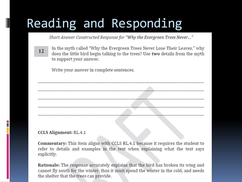 Reading and Responding • Several reading passages, both literary and informational texts • Multiple-choice items that measure reading comprehension • Multiple-choice items that measure important vocabulary in the passages • Complex constructed-response items that ask students to analyze one or two passages and use evidence from the text(s) in their written responses