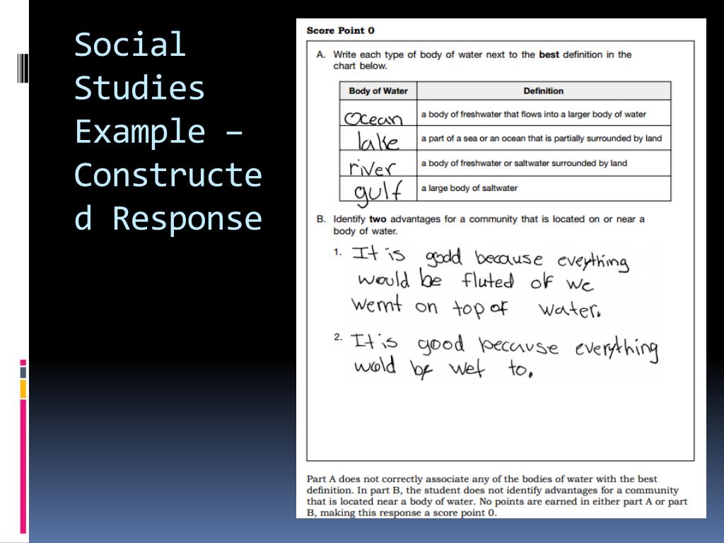Social Studies • 50 MC Items (across 4 strands) • Geography • Civics • Economics • History • Extended CR item (4 points) • 4 items (1 per strand)
