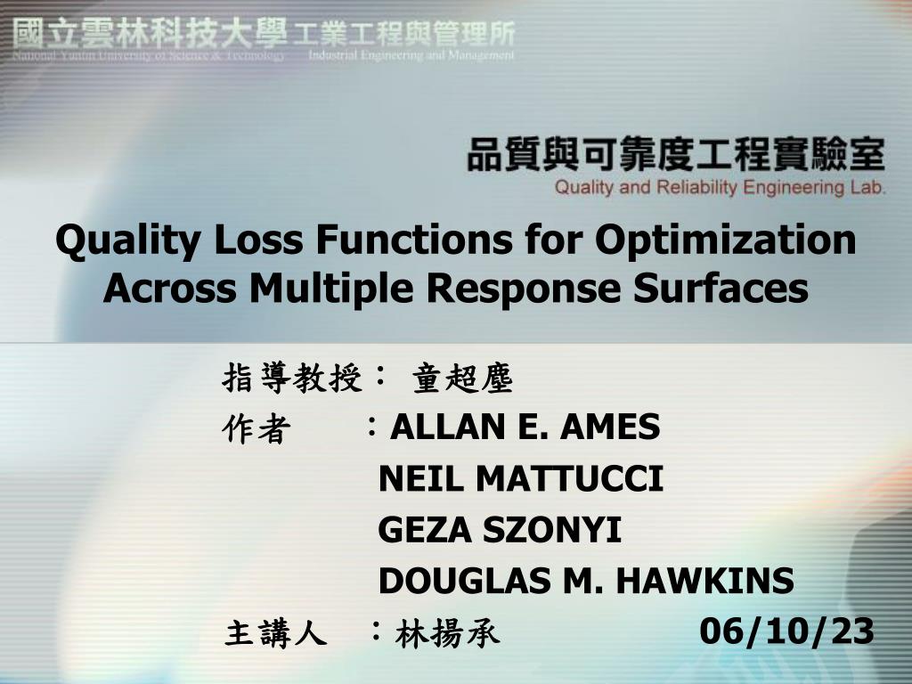 Quality Loss Functions for Optimization Across Multiple Response Surfaces. 指導教授: 童超塵 作者 : ALLAN E. AMES NEIL MATTUCCI GEZA SZONYI DOUGLAS M. HAWKINS 主講人 :林揚承 06/10/23. Introduction.