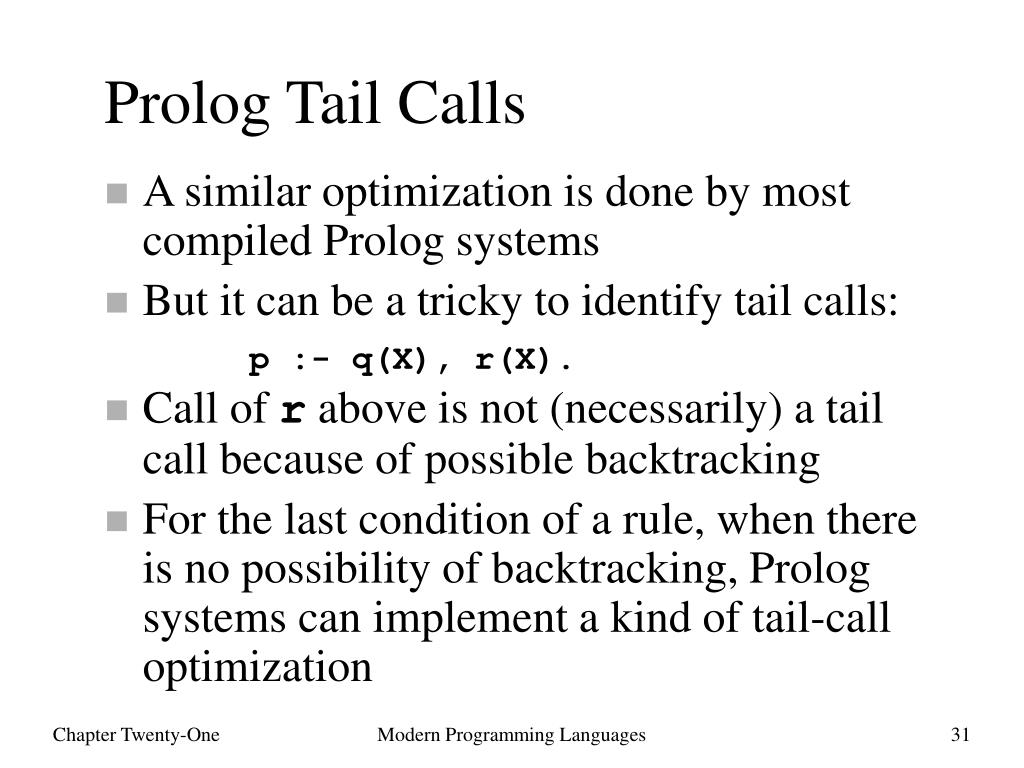 Prolog Tail Calls • A similar optimization is done by most compiled Prolog systems • But it can be a tricky to identify tail calls: • Call of r above is not (necessarily) a tail call because of possible backtracking • For the last condition of a rule, when there is no possibility of backtracking, Prolog systems can implement a kind of tail-call optimization p :- q(X), r(X). Modern Programming Languages