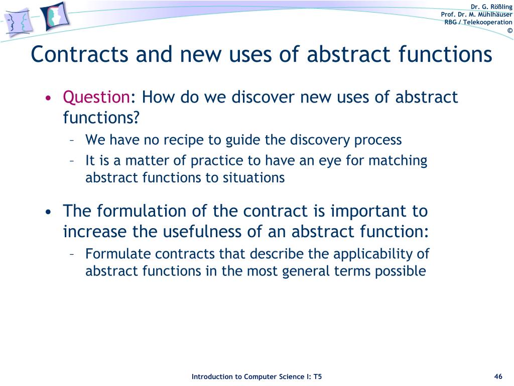 Contracts and new uses of abstract functions • Question: How do we discover new uses of abstract functions? • We have no recipe to guide the discovery process • It is a matter of practice to have an eye for matching abstract functions to situations • The formulation of the contract is important to increase the usefulness of an abstract function: • Formulate contracts that describe the applicability of abstract functions in the most general terms possible