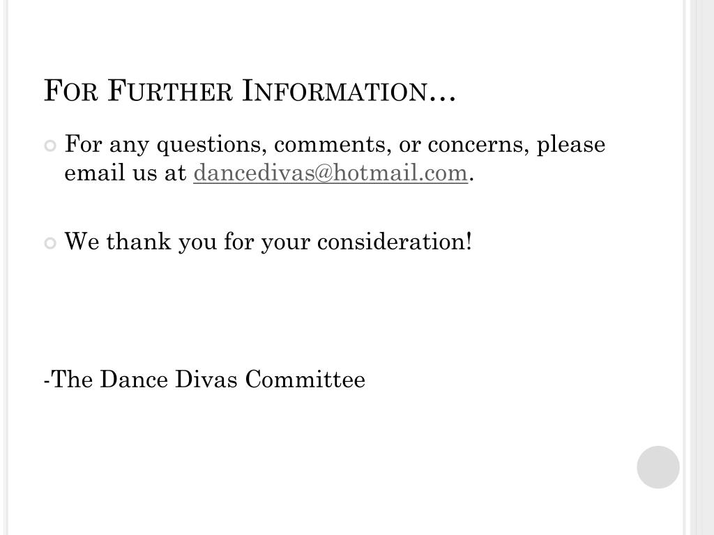 For Further Information… • For any questions, comments, or concerns, please email us at dancedivas@hotmail.com. • We thank you for your consideration! -The Dance Divas Committee