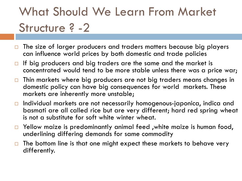 What Should We Learn From Market Structure ? -2 • The size of larger producers and traders matters because big players can influence world prices by both domestic and trade policies • If big producers and big traders are the same and the market is concentrated would tend to be more stable unless there was a price war; • Thin markets where big producers are not big traders means changes in domestic policy can have big consequences for world markets. These markets are inherently more unstable; • Individual markets are not necessarily homogenous-japonica, indica and basmati are all called rice but are very different; hard red spring wheat is not a substitute for soft white winter wheat. • Yellow maize is predominantly animal feed ,white maize is human food, underlining differing demands for same commodity • The bottom line is that one might expect these markets to behave very differently.