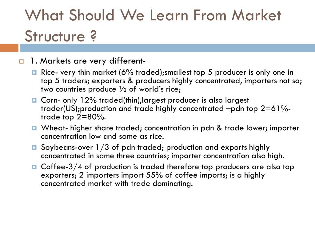 What Should We Learn From Market Structure ? • 1. Markets are very different- • Rice- very thin market (6% traded);smallest top 5 producer is only one in top 5 traders; exporters & producers highly concentrated, importers not so; two countries produce ½ of world’s rice; • Corn- only 12% traded(thin),largest producer is also largest trader(US);production and trade highly concentrated –pdn top 2=61%-trade top 2=80%. • Wheat- higher share traded; concentration in pdn & trade lower; importer concentration low and same as rice. • Soybeans-over 1/3 of pdn traded; production and exports highly concentrated in same three countries; importer concentration also high. • Coffee-3/4 of production is traded therefore top producers are also top exporters; 2 importers import 55% of coffee imports; is a highly concentrated market with trade dominating.