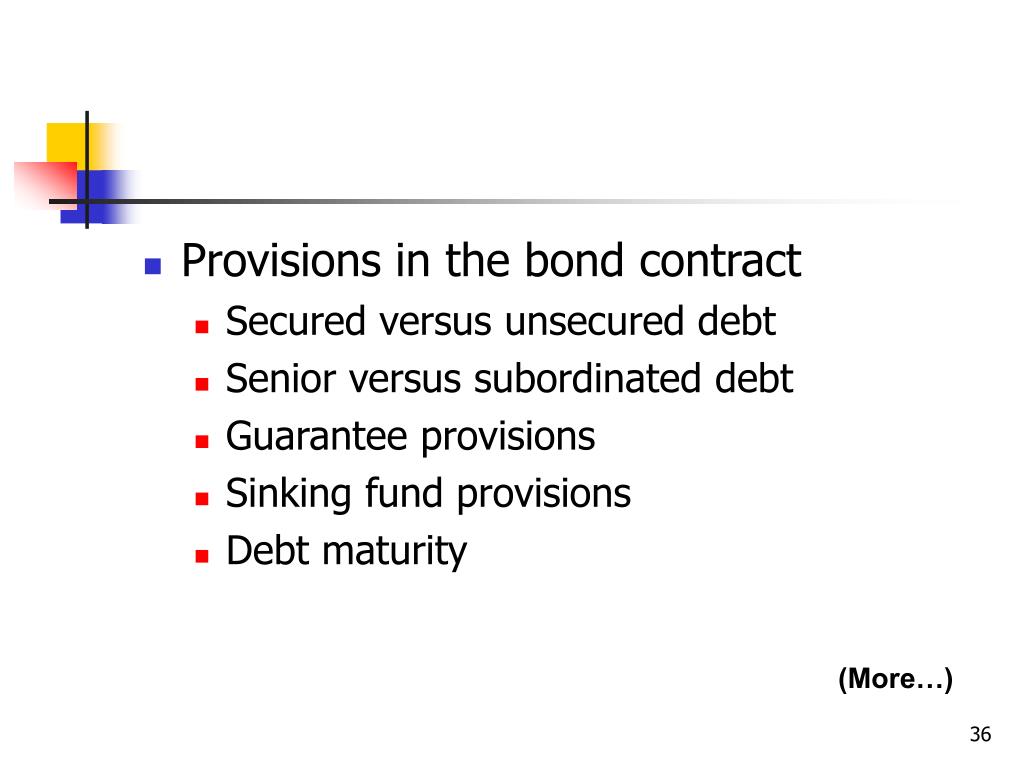 Provisions in the bond contract • Secured versus unsecured debt • Senior versus subordinated debt • Guarantee provisions • Sinking fund provisions • Debt maturity (More…)