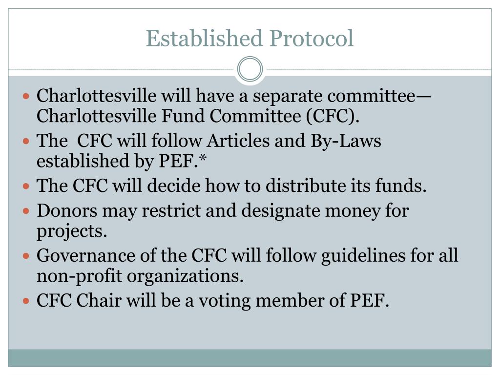 Established Protocol Charlottesville will have a separate committee—Charlottesville Fund Committee (CFC). The CFC will follow Articles and By-Laws established by PEF.* The CFC will decide how to distribute its funds. Donors may restrict and designate money for projects. Governance of the CFC will follow guidelines for all non-profit organizations. CFC Chair will be a voting member of PEF.