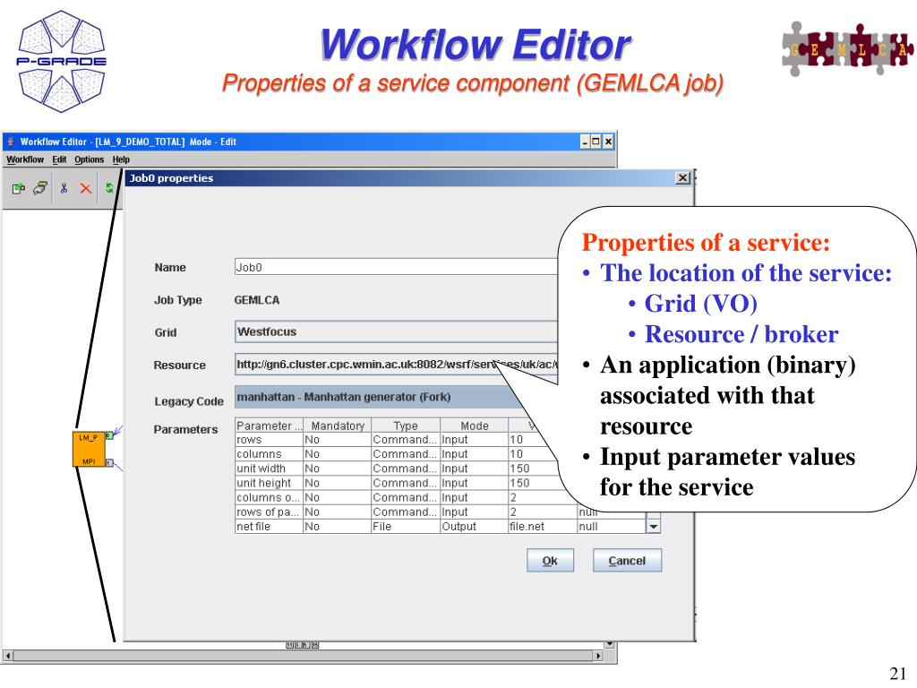 Workflow EditorProperties of a service component (GEMLCA job) • Properties of a service: • The location of the service: • Grid (VO) • Resource / broker • An application (binary) associated with that resource • Input parameter values for the service