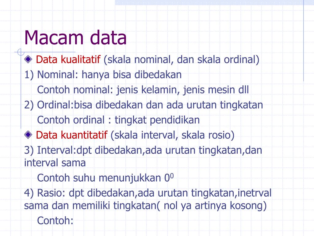 Macam data • Data kualitatif (skala nominal, dan skala ordinal) 1) Nominal: hanya bisa dibedakan Contoh nominal: jenis kelamin, jenis mesin dll 2) Ordinal:bisa dibedakan dan ada urutan tingkatan Contoh ordinal : tingkat pendidikan • Data kuantitatif (skala interval, skala rosio) 3) Interval:dpt dibedakan,ada urutan tingkatan,dan interval sama Contoh suhu menunjukkan 00 4) Rasio: dpt dibedakan,ada urutan tingkatan,inetrval sama dan memiliki tingkatan( nol ya artinya kosong) Contoh: