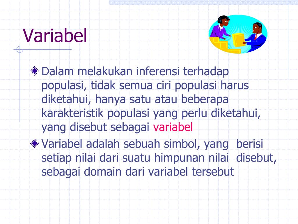 Variabel • Dalam melakukan inferensi terhadap populasi, tidak semua ciri populasi harus diketahui, hanya satu atau beberapa karakteristik populasi yang perlu diketahui, yang disebut sebagai variabel • Variabel adalah sebuah simbol, yang berisi setiap nilai dari suatu himpunan nilai disebut, sebagai domain dari variabel tersebut