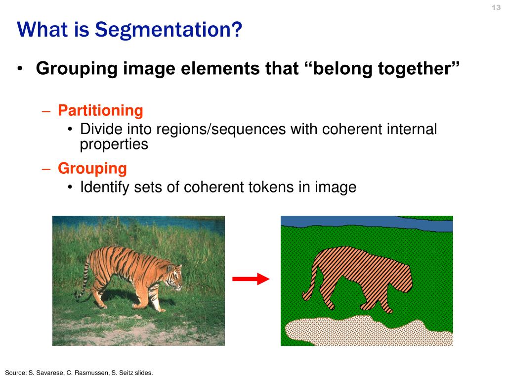 What is Segmentation? • Grouping image elements that “belong together” • Partitioning • Divide into regions/sequences with coherent internal properties • Grouping • Identify sets of coherent tokensin image Source: S. Savarese, C. Rasmussen, S. Seitz slides.