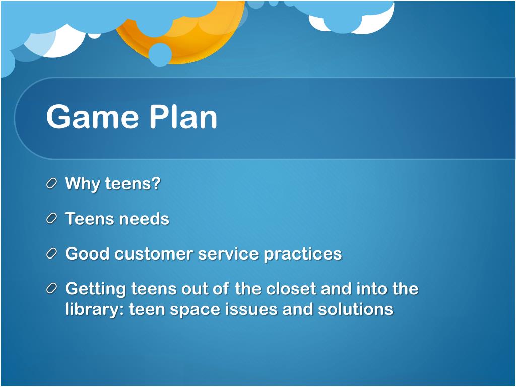 Teen Services. For Adult Services Librarians. Game Plan. Why teens? Teens needs Good customer service practices Getting teens out of the closet and into the library: teen space issues and solutions. The Importance of Teens. Simply stated libraries needs teens