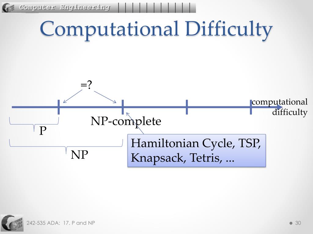 Computational Difficulty =? computational difficulty NP-complete P Hamiltonian Cycle, TSP,Knapsack, Tetris, ... NP