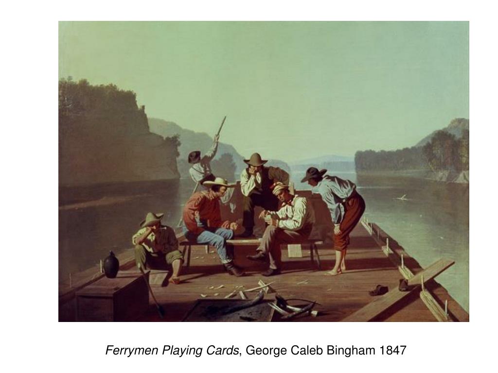 Artistic Reactions to Jacksonian Democracy • American artist George Caleb Bingham (1811-1879) lived in the Missouri Territory where he portrayed its frontier scenes in his paintings. • He was inspired by the style known as “genre painting” in which an artist creates realistic depictions of everyday life (form of Romanticism Art) • Bingham was a member of the Whig Party and his politics came together in a series of paintings in the 1850s depicting a local election in Missouri.