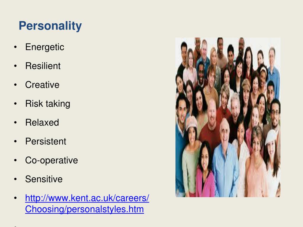 Personality • Energetic • Resilient • Creative • Risk taking • Relaxed • Persistent • Co-operative • Sensitive • http://www.kent.ac.uk/careers/Choosing/personalstyles.htm