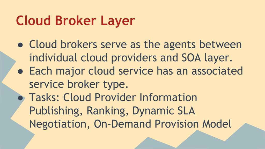 Cloud Broker Layer • Cloud brokers serve as the agents between individual cloud providers and SOA layer. • Each major cloud service has an associated service broker type. • Tasks: Cloud Provider Information Publishing, Ranking, Dynamic SLA Negotiation, On-Demand Provision Model