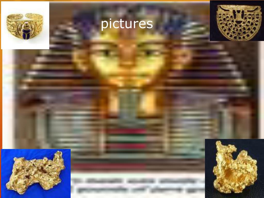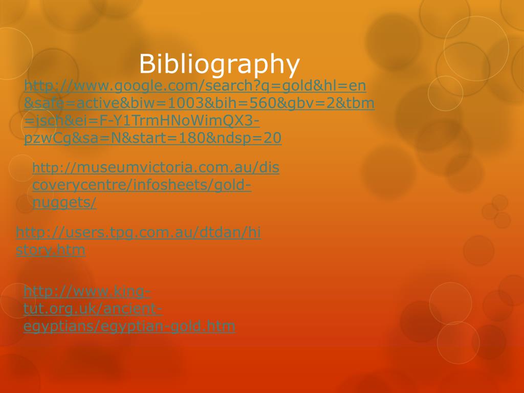 Bibliography http://www.google.com/search?q=gold&hl=en&safe=active&biw=1003&bih=560&gbv=2&tbm=isch&ei=F-Y1TrmHNoWimQX3-pzwCg&sa=N&start=180&ndsp=20 http://museumvictoria.com.au/discoverycentre/infosheets/gold-nuggets/ http://users.tpg.com.au/dtdan/history.htm http://www.king-tut.org.uk/ancient-egyptians/egyptian-gold.htm