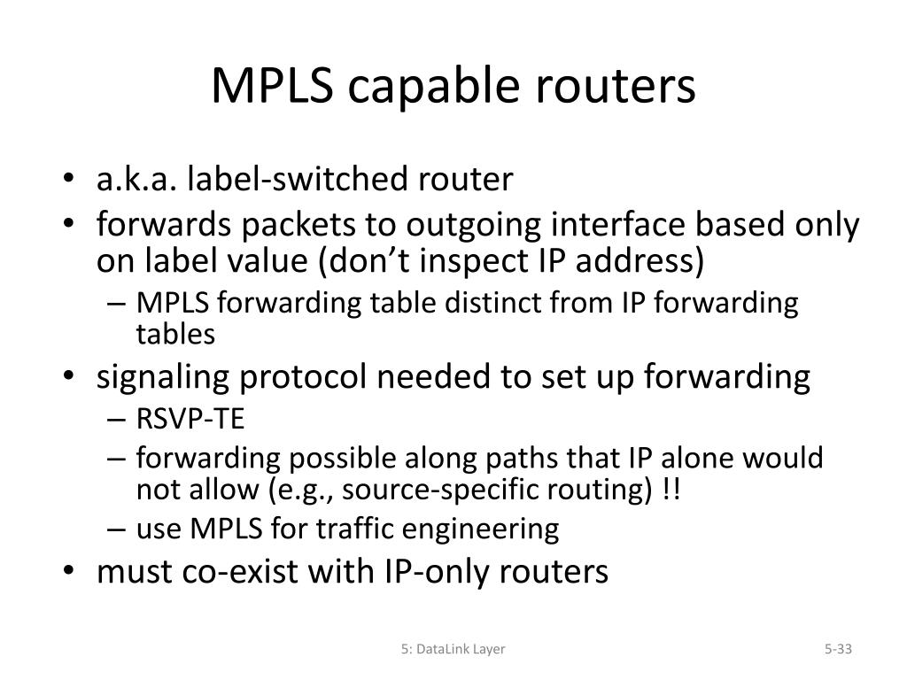 MPLS capable routers • a.k.a. label-switched router • forwards packets to outgoing interface based only on label value (don’t inspect IP address) • MPLS forwarding table distinct from IP forwarding tables • signaling protocol needed to set up forwarding • RSVP-TE • forwarding possible along paths that IP alone would not allow (e.g., source-specific routing) !! • use MPLS for traffic engineering • must co-exist with IP-only routers 5: DataLink Layer