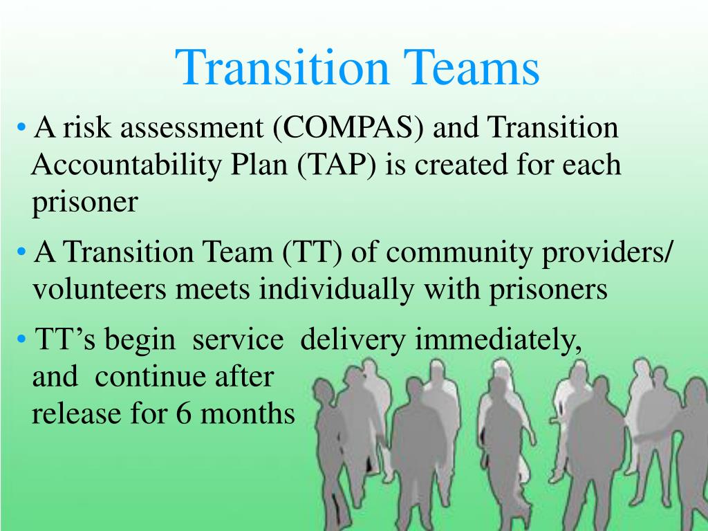 Transition Teams •A risk assessment (COMPAS) and Transition Accountability Plan (TAP) is created for each prisoner •A Transition Team (TT) of community providers/ volunteers meets individually with prisoners •TT’s begin service delivery immediately, and continue after release for 6 months