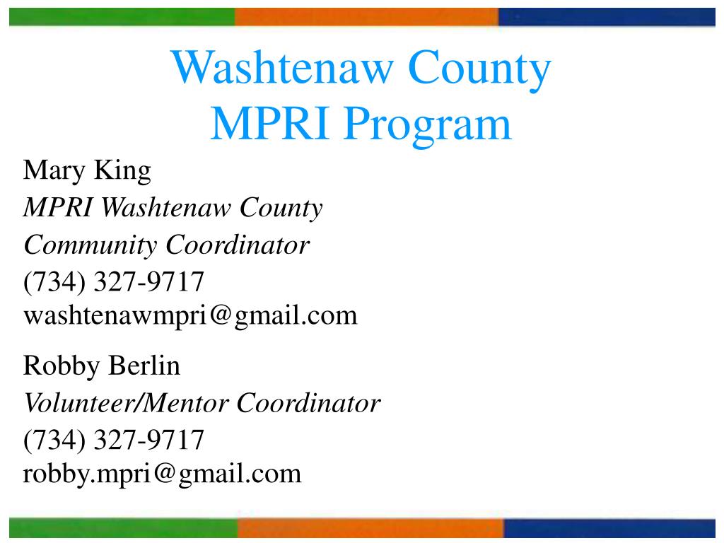 Washtenaw CountyMPRI Program Mary King MPRI Washtenaw County Community Coordinator (734) 327-9717washtenawmpri@gmail.com Robby Berlin Volunteer/Mentor Coordinator (734) 327-9717 robby.mpri@gmail.com