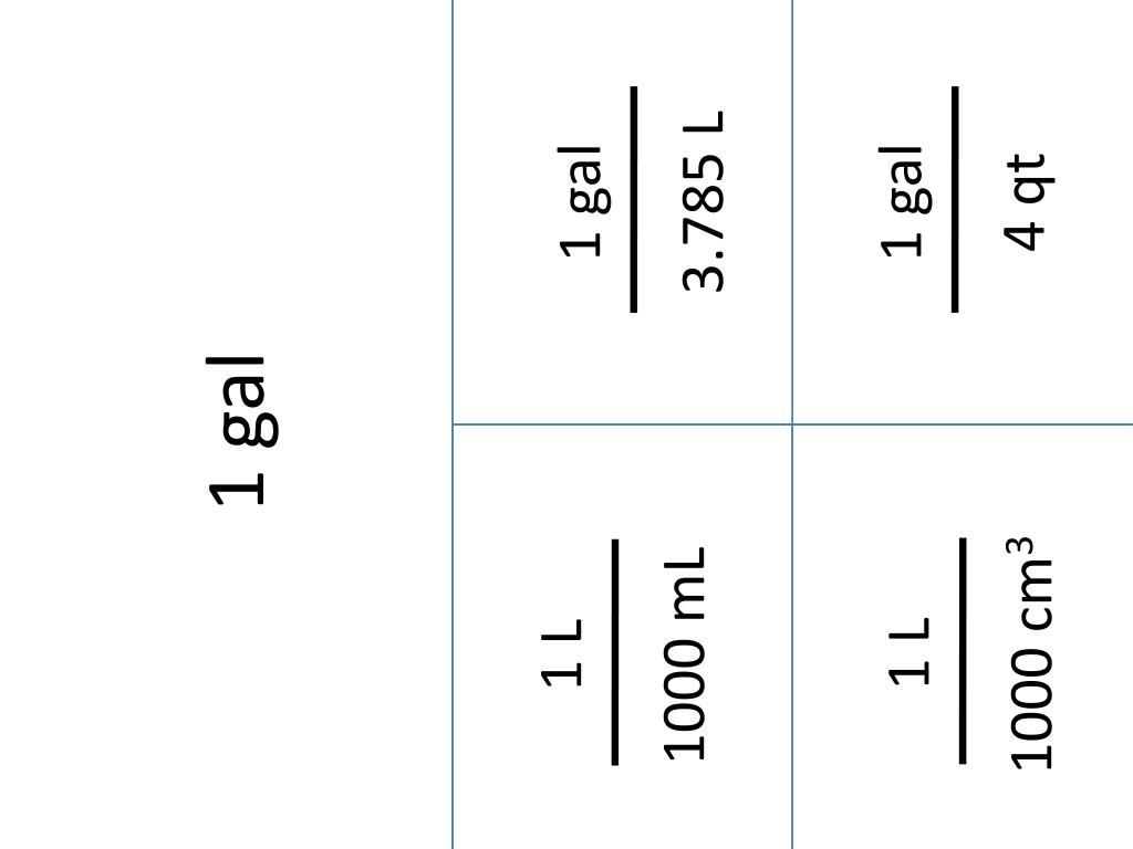 1000 mL 1 L 1000 cm3 1 L 1 gal 4 qt 1 gal 3.785 L 1 gal
