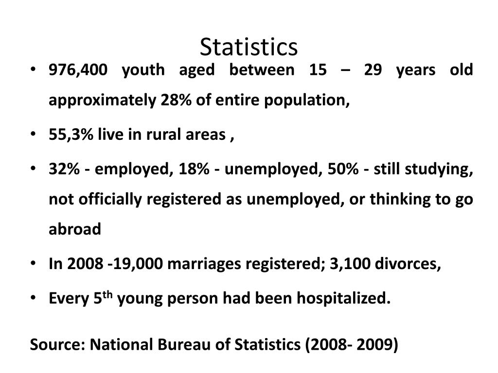 Statistics • 976,400 youth aged between 15 – 29 years old approximately 28% of entire population, • 55,3% live in rural areas , • 32% - employed, 18% - unemployed, 50% - still studying, not officially registered as unemployed, or thinking to go abroad • In 2008 -19,000 marriages registered; 3,100 divorces, • Every 5th young person had been hospitalized. Source: National Bureau of Statistics (2008- 2009)