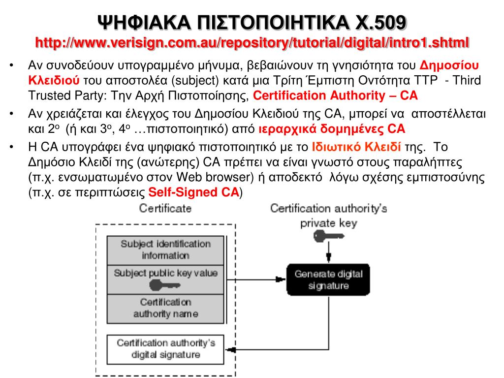 ΨΗΦΙΑΚΑ ΠΙΣΤΟΠΟΙΗΤΙΚΑ Χ.509http://www.verisign.com.au/repository/tutorial/digital/intro1.shtml • Αν συνοδεύουν υπογραμμένο μήνυμα, βεβαιώνουν τη γνησιότητα του Δημοσίου Κλειδιούτου αποστολέα (subject) κατά μια Τρίτη Έμπιστη Οντότητα TTP - Third Trusted Party: ΤηνΑρχή Πιστοποίησης, Certification Authority – CA • Αν χρειάζεται και έλεγχος του Δημοσίου Κλειδιού της CA, μπορεί νααποστέλλεται και 2ο (ή και 3ο, 4ο …πιστοποιητικό) από ιεραρχικά δομημένες CA • Η CA υπογράφει ένα ψηφιακό πιστοποιητικό με το Ιδιωτικό Κλειδί της. Το Δημόσιο Κλειδί της (ανώτερης) CA πρέπει να είναι γνωστό στους παραλήπτες (π.χ. ενσωματωμένο στον Web browser) ή αποδεκτό λόγω σχέσης εμπιστοσύνης (π.χ. σε περιπτώσεις Self-Signed CA)