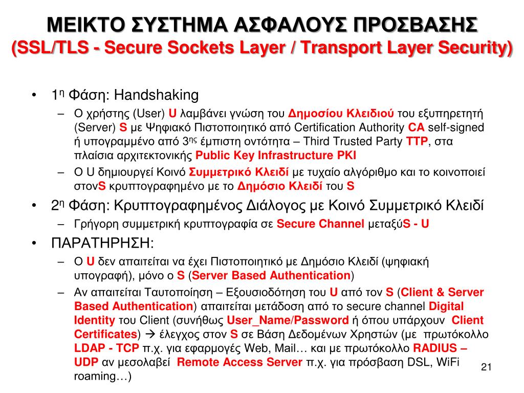 ΜΕΙΚΤΟ ΣΥΣΤΗΜΑ ΑΣΦΑΛΟΥΣ ΠΡΟΣΒΑΣΗΣ(SSL/TLS - Secure Sockets Layer / Transport Layer Security) • 1η Φάση: Handshaking • Ο χρήστης (User) Uλαμβάνει γνώση του Δημοσίου Κλειδιού του εξυπηρετητή (Server) S με Ψηφιακό Πιστοποιητικό από Certification Authority CAself-signed ή υπογραμμένο από 3ης έμπιστη οντότητα – Third Trusted Party TTP, στα πλαίσια αρχιτεκτονικής Public Key Infrastructure PKI • Ο U δημιουργεί Κοινό Συμμετρικό Κλειδί με τυχαίο αλγόριθμο και το κοινοποιεί στονSκρυπτογραφημένο με το Δημόσιο Κλειδί του S • 2η Φάση: Κρυπτογραφημένος Διάλογος με Κοινό Συμμετρικό Κλειδί • Γρήγορη συμμετρική κρυπτογραφία σε Secure Channel μεταξύS - U • ΠΑΡΑΤΗΡΗΣΗ: • Ο Uδεν απαιτείται να έχει Πιστοποιητικό με Δημόσιο Κλειδί (ψηφιακή υπογραφή), μόνο ο S (Server Based Authentication) • Αν απαιτείται Ταυτοποίηση – Εξουσιοδότηση του Uαπό τον S (Client & Server Based Authentication) απαιτείταιμετάδοση από το secure channelDigital Identityτου Client(συνήθως User_Name/Password ήόπου υπάρχουν Client Certificates) έλεγχος στονS σεΒάση Δεδομένων Χρηστών (με πρωτόκολλο LDAP - TCP π.χ. για εφαρμογές Web, Mail… και με πρωτόκολλοRADIUS – UDP αν μεσολαβεί Remote Access Server π.χ.για πρόσβαση DSL, WiFi roaming…)