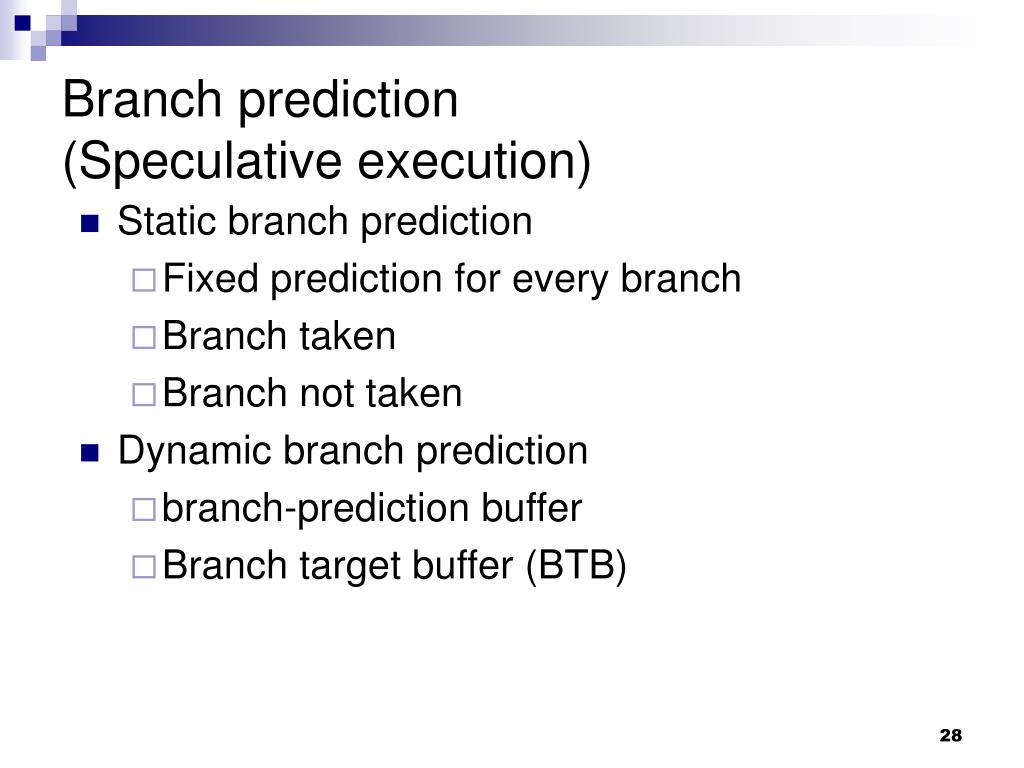 Branch prediction(Speculative execution) • Static branch prediction • Fixed prediction for every branch • Branch taken • Branch not taken • Dynamic branch prediction • branch-prediction buffer • Branch target buffer (BTB)