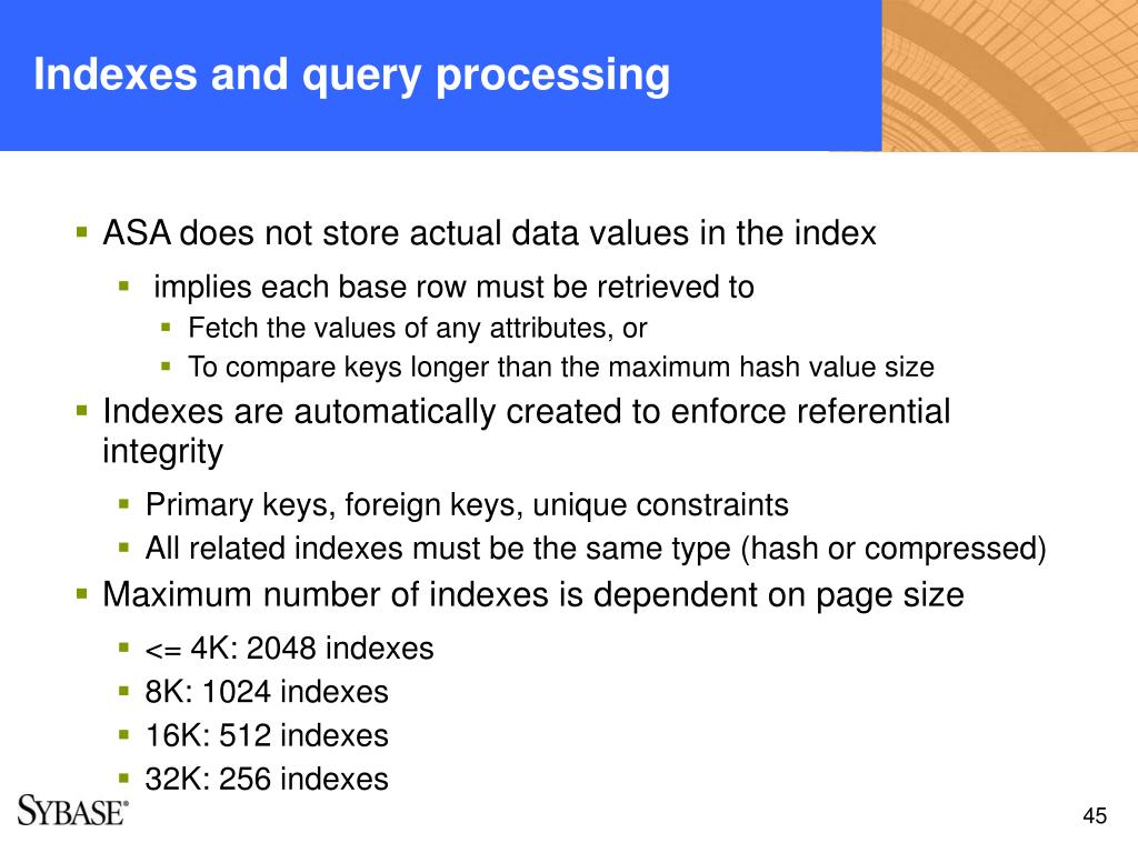 Indexes and query processing • ASA does not store actual data values in the index • implies each base row must be retrieved to • Fetch the values of any attributes, or • To compare keys longer than the maximum hash value size • Indexes are automatically created to enforce referential integrity • Primary keys, foreign keys, unique constraints • All related indexes must be the same type (hash or compressed) • Maximum number of indexes is dependent on page size • <= 4K: 2048 indexes • 8K: 1024 indexes • 16K: 512 indexes • 32K: 256 indexes
