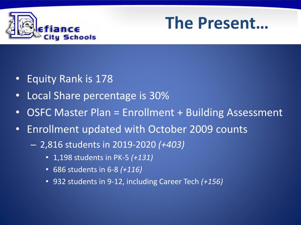 The Present… • Equity Rank is 178 • Local Share percentage is 30% • OSFC Master Plan = Enrollment + Building Assessment • Enrollment updated with October 2009 counts • 2,816 students in 2019-2020 (+403) • 1,198 students in PK-5 (+131) • 686 students in 6-8 (+116) • 932 students in 9-12, including Career Tech (+156)