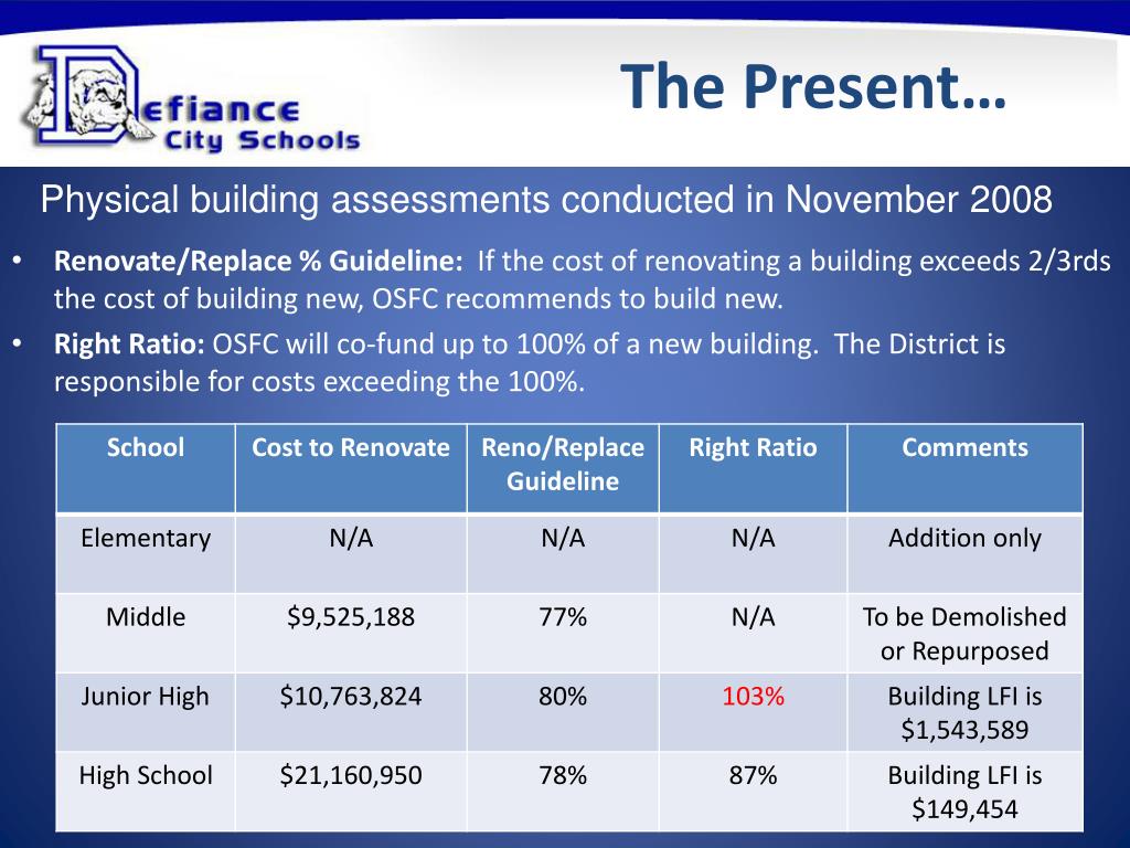 The Present… Physical building assessments conducted in November 2008 • Renovate/Replace % Guideline: If the cost of renovating a building exceeds 2/3rds the cost of building new, OSFC recommends to build new. • Right Ratio: OSFC will co-fund up to 100% of a new building. The District is responsible for costs exceeding the 100%.