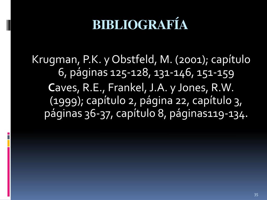 BIBLIOGRAFÍA Krugman, P.K. y Obstfeld, M. (2001); capítulo 6, páginas 125-128, 131-146, 151-159 Caves, R.E., Frankel, J.A. y Jones, R.W. (1999); capítulo 2, página 22, capítulo 3, páginas 36-37, capítulo 8, páginas119-134.