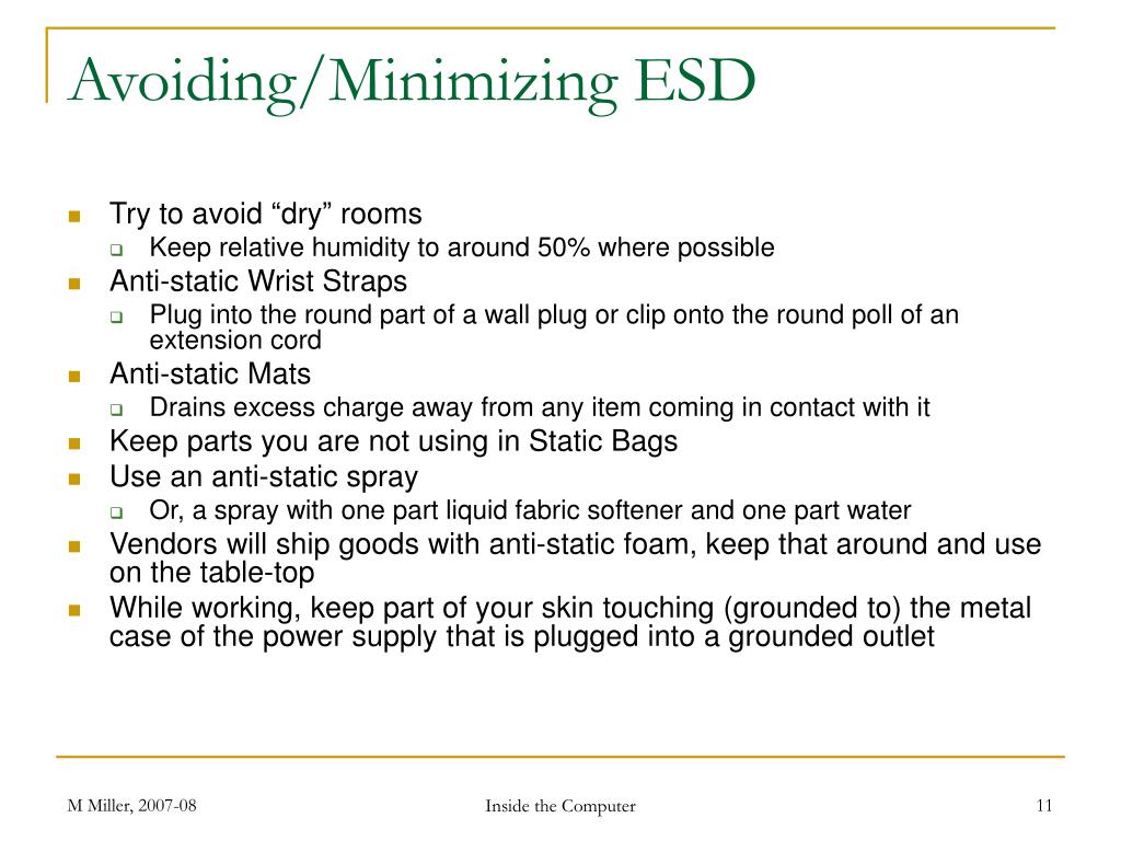 Avoiding/Minimizing ESD • Try to avoid “dry” rooms • Keep relative humidity to around 50% where possible • Anti-static Wrist Straps • Plug into the round part of a wall plug or clip onto the round poll of an extension cord • Anti-static Mats • Drains excess charge away from any item coming in contact with it • Keep parts you are not using in Static Bags • Use an anti-static spray • Or, a spray with one part liquid fabric softener and one part water • Vendors will ship goods with anti-static foam, keep that around and use on the table-top • While working, keep part of your skin touching (grounded to) the metal case of the power supply that is plugged into a grounded outlet Inside the Computer