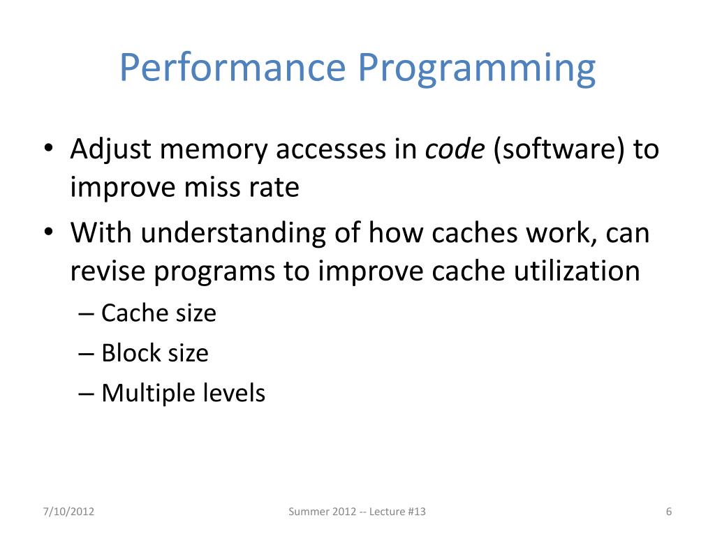 Performance Programming • Adjust memory accesses in code (software) to improve miss rate • With understanding of how caches work, can revise programs to improve cache utilization • Cache size • Block size • Multiple levels Summer 2012 -- Lecture #13