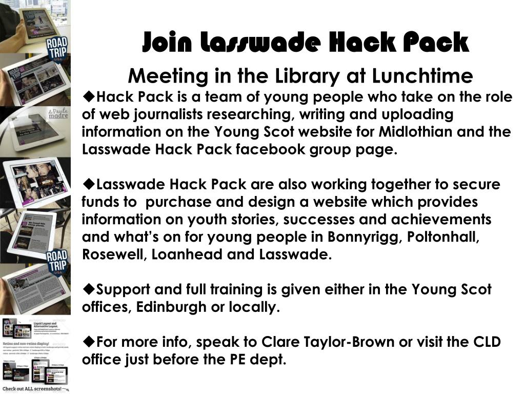 Meeting in the Library at Lunchtime • Hack Pack is a team of young people who take on the role of web journalists researching, writing and uploading information on the Young Scot website for Midlothian and the Lasswade Hack Pack facebook group page. • Lasswade Hack Pack are also working together to secure funds to purchase and design a website which provides information on youth stories, successes and achievements and what’s on for young people in Bonnyrigg, Poltonhall, Rosewell, Loanhead and Lasswade. • Support and full training is given either in the Young Scot offices, Edinburgh or locally. • For more info, speak to Clare Taylor-Brown or visit the CLD office just before the PE dept. Join Lasswade Hack Pack