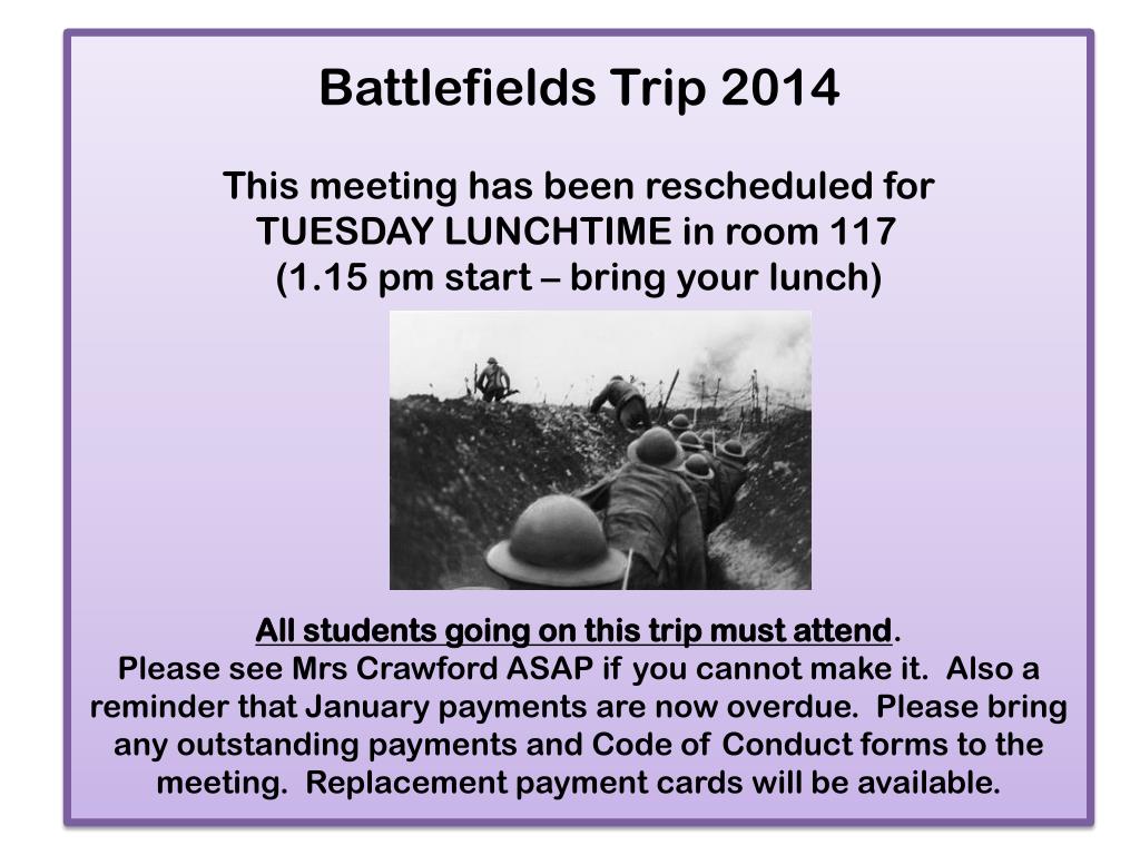 Battlefields Trip 2014 This meeting has been rescheduled for TUESDAY LUNCHTIME in room 117 (1.15 pm start – bring your lunch) All students going on this trip must attend. Please see Mrs Crawford ASAP if you cannot make it. Also a reminder that January payments are now overdue. Please bring any outstanding payments and Code of Conduct forms to the meeting. Replacement payment cards will be available.