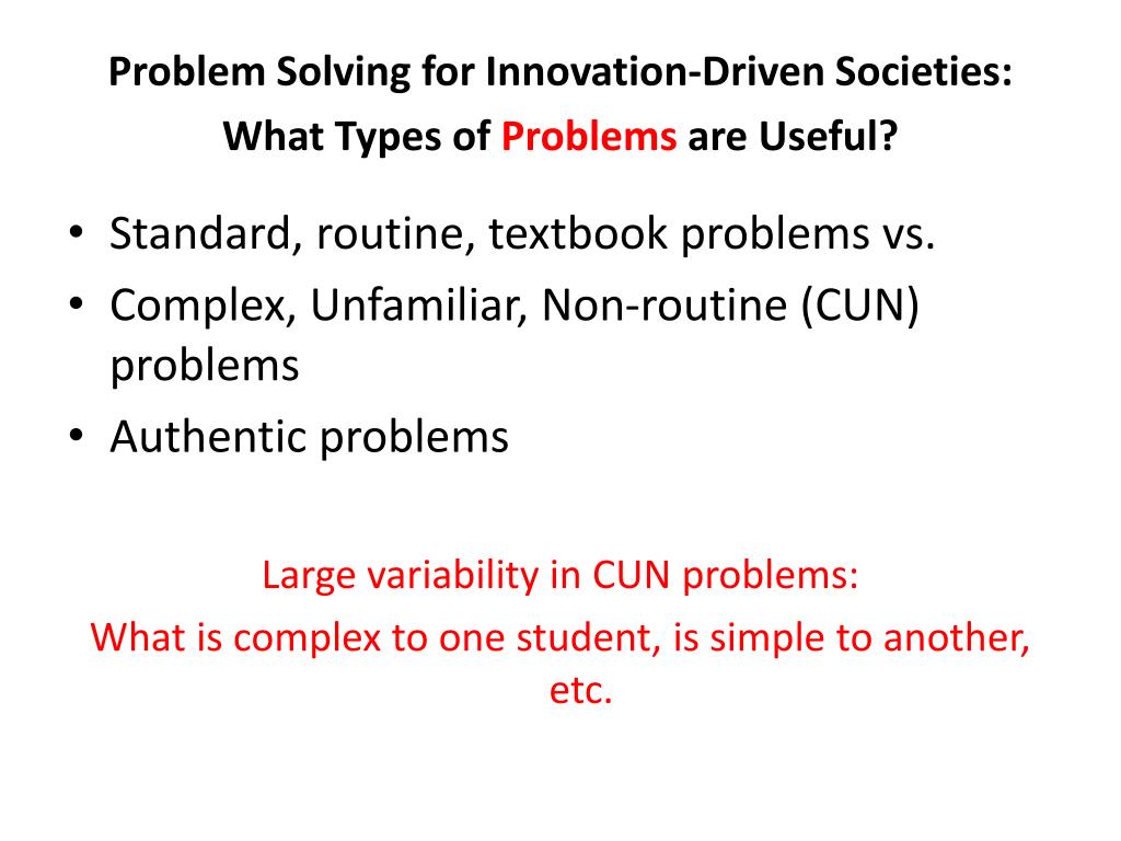 Problem Solving for Innovation-Driven Societies: What Types of Problems are Useful? • Standard, routine, textbook problems vs. • Complex, Unfamiliar, Non-routine (CUN) problems • Authentic problems Large variability in CUN problems: What is complex to one student, is simple to another, etc.
