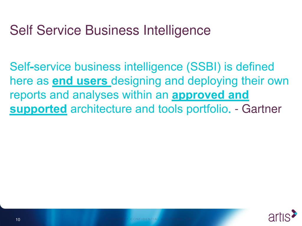 Self Service Business Intelligence Self-service business intelligence (SSBI) is defined here as end users designing and deploying their own reports and analyses within an approved and supported architecture and tools portfolio. - Gartner