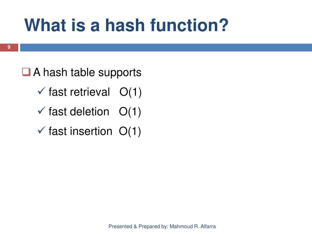 What is a hash function? 9 • A hash table supports • fast retrieval O(1) • fast deletion O(1) • fast insertion O(1) Presented & Prepared by: Mahmoud R. Alfarra