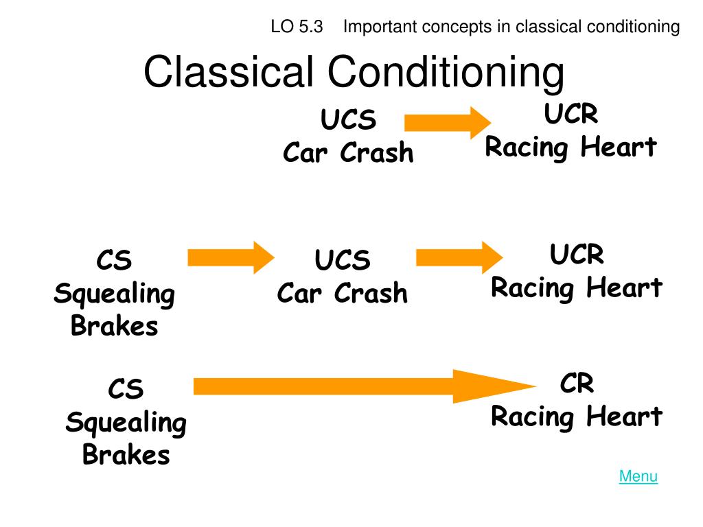 LO 5.3 Important concepts in classical conditioning Classical Conditioning UCR Racing Heart UCS Car Crash UCR Racing Heart CS Squealing Brakes UCS Car Crash CR Racing Heart CS Squealing Brakes Menu