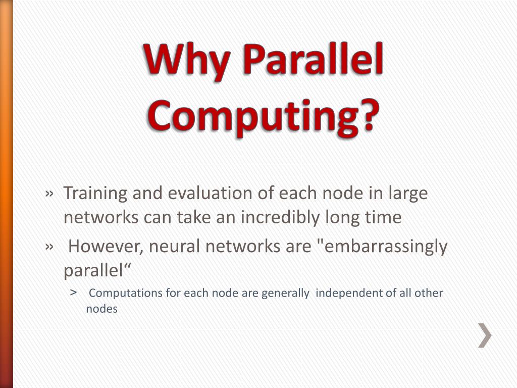 Training and evaluation of each node in large networks can take an incredibly long time • However, neural networks are "embarrassingly parallel“ • Computations for each node are generally independent of all other nodes Why Parallel Computing?