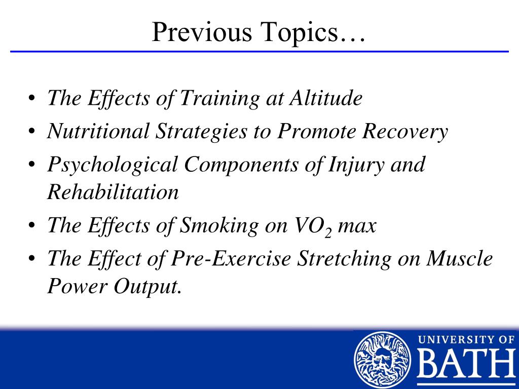 Previous Topics… • The Effects of Training at Altitude • Nutritional Strategies to Promote Recovery • Psychological Components of Injury and Rehabilitation • The Effects of Smoking on VO2 max • The Effect of Pre-Exercise Stretching on Muscle Power Output.