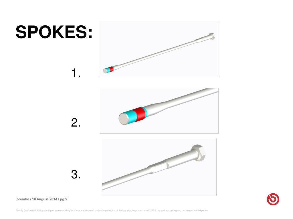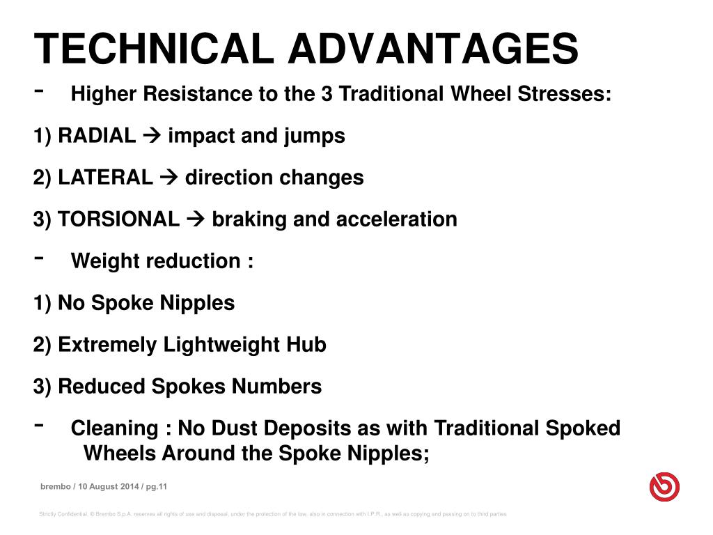 TECHNICAL ADVANTAGES • Higher Resistance to the 3 Traditional Wheel Stresses: • 1)RADIAL impact and jumps • 2) LATERAL direction changes • 3) TORSIONAL braking and acceleration • Weight reduction : • 1) No Spoke Nipples • 2) Extremely Lightweight Hub • 3) Reduced Spokes Numbers • Cleaning : No Dust Deposits as with Traditional Spoked Wheels Around the Spoke Nipples;