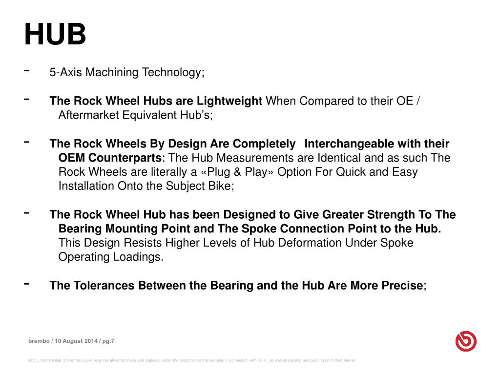 HUB • 5-Axis Machining Technology; • The Rock Wheel Hubs are Lightweight When Compared to their OE / Aftermarket Equivalent Hub’s; • The Rock Wheels By Design Are Completely Interchangeable with their OEM Counterparts: The Hub Measurements are Identical and as such The Rock Wheels are literally a «Plug & Play» Option For Quick and Easy Installation Onto the Subject Bike; • The Rock Wheel Hub has been Designed to Give Greater Strength To The Bearing Mounting Point and The Spoke Connection Point to the Hub. This Design Resists Higher Levels of Hub Deformation Under Spoke Operating Loadings. • The Tolerances Between the Bearing and the Hub Are More Precise;