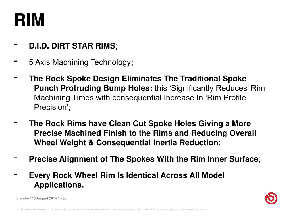RIM • D.I.D. DIRT STAR RIMS; • 5 Axis Machining Technology; • The Rock Spoke Design Eliminates The Traditional Spoke Punch Protruding Bump Holes: this ‘Significantly Reduces’ Rim Machining Times with consequential Increase In ‘Rim Profile Precision’; • The Rock Rims have Clean Cut Spoke Holes Giving a More Precise Machined Finish to the Rims and Reducing Overall Wheel Weight & Consequential Inertia Reduction; • Precise Alignment of The Spokes With the Rim Inner Surface; • Every Rock Wheel Rim Is Identical Across All Model Applications.