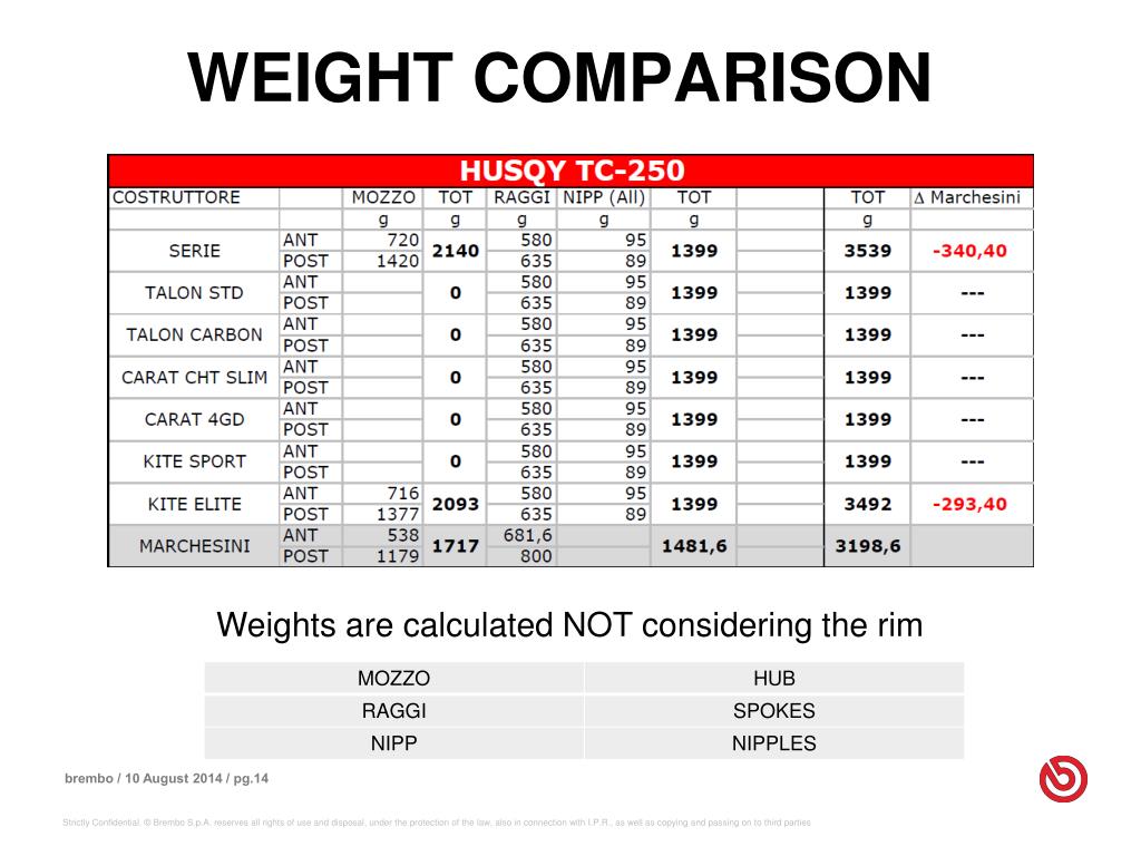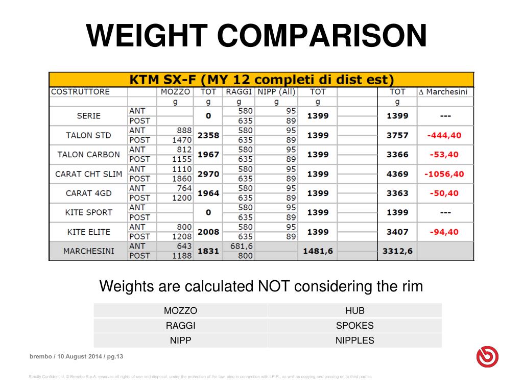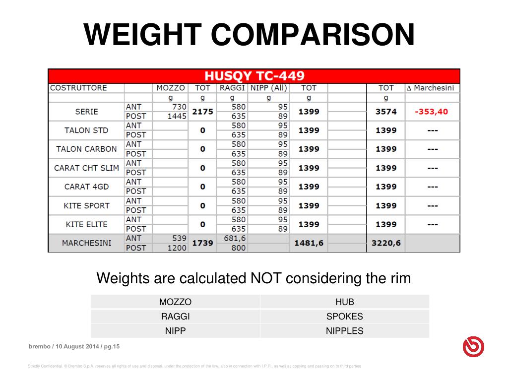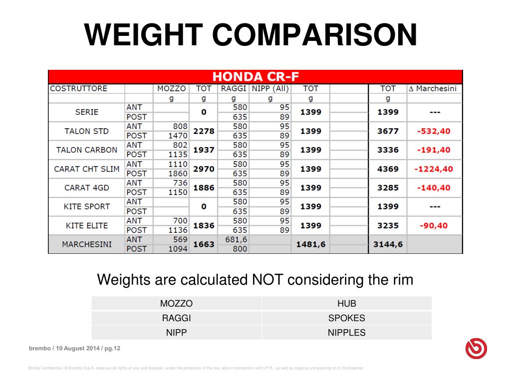 WEIGHT COMPARISON Weights are calculated NOT considering the rim