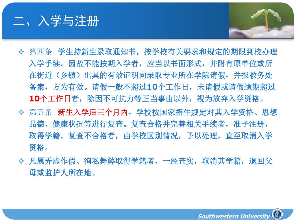 二、入学与注册 • 第四条 学生持新生录取通知书,按学校有关要求和规定的期限到校办理入学手续。因故不能按期入学者,应当以书面形式,并附有原单位或所在街道(乡镇)出具的有效证明向录取专业所在学院请假,并报教务处备案,方为有效。请假一般不超过10个工作日,未请假或请假逾期超过10个工作日者,除因不可抗力等正当事由以外,视为放弃入学资格。 • 第五条 新生入学后三个月内,学校按国家招生规定对其入学资格、思想品德、健康状况等进行复查。复查合格并完善相关手续者,准予注册,取得学籍。复查不合格者,由学校区别情况,予以处理,直至取消入学资格。 • 凡属弄虚作假、徇私舞弊取得学籍者,一经查实,取消其学籍,退回父母或监护人所在地。 Southwestern University